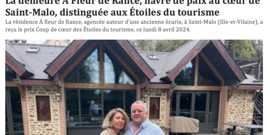 La résidence À fleur de Rance, agencée autour d’une ancienne écurie, à Saint-Malo (Ille-et-Vilaine), a reçu le prix Coup de cœur des Étoiles du tourisme, ce lundi 8 avril 2024.